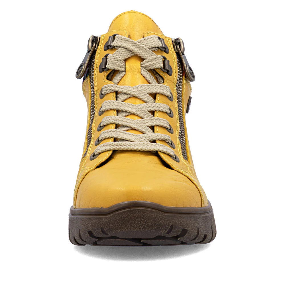 Maximum comfort at every turn! These yellow Rieker lace-up boots are made of smooth leather and offer real comfort for the feet. The clever combination of lacing and zipper provides optimal support and makes the shoe easy to put on and take off. The padded shaft edge provides the perfect finish and a striking look. The sole is both shock-absorbing and ultra light, offering a double sense of well-being at every step. With the padded and removable insole, the boots have another practical comfort feature. Moreover, the extra width offers your feet more freedom of movement in the forefoot area. The shoes are equipped with a water-repellent membrane for dry feet in wind and weather. Nothing stands in the way of long walks!
